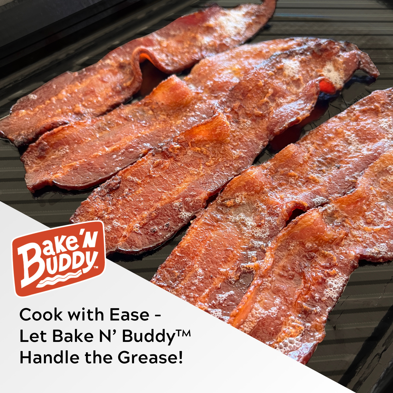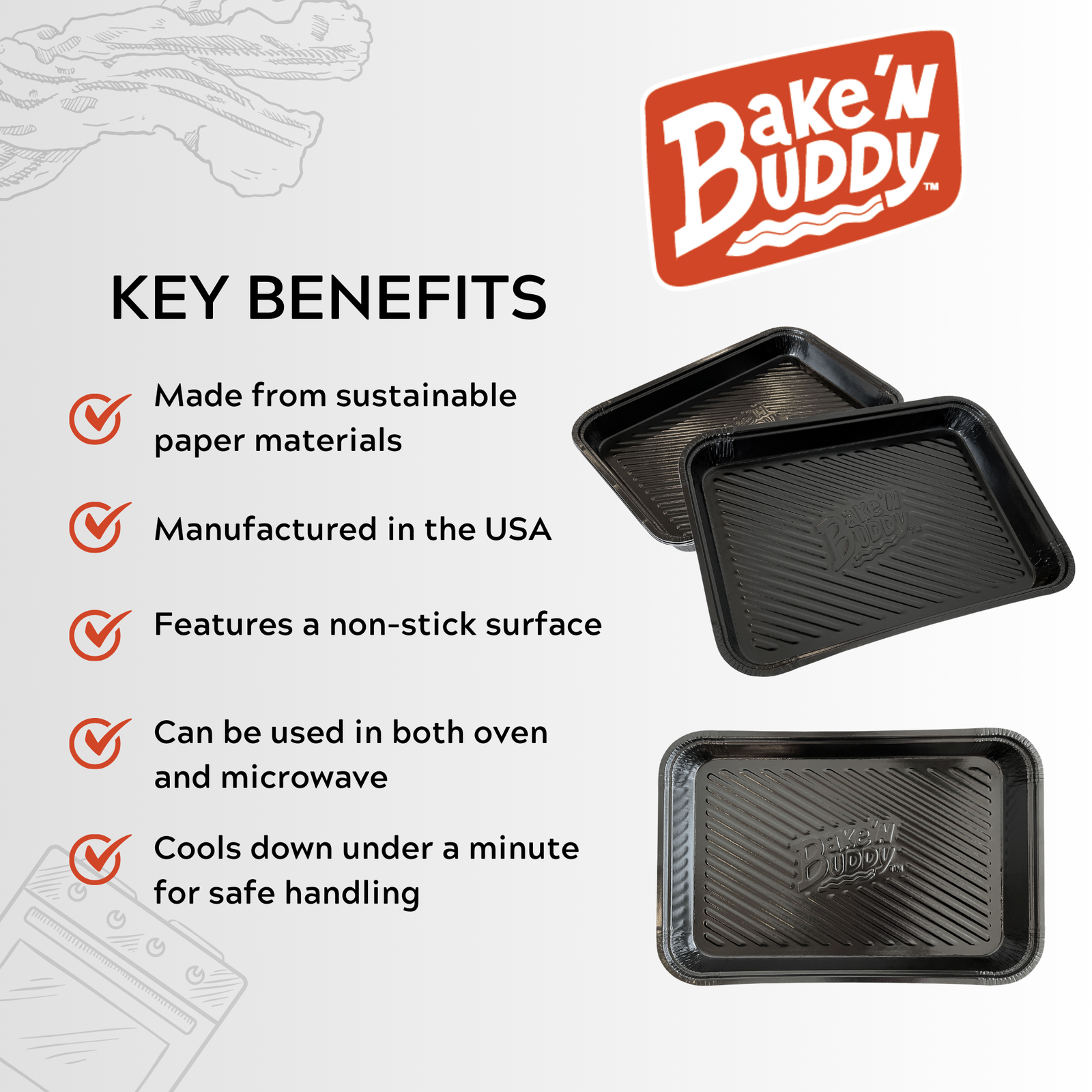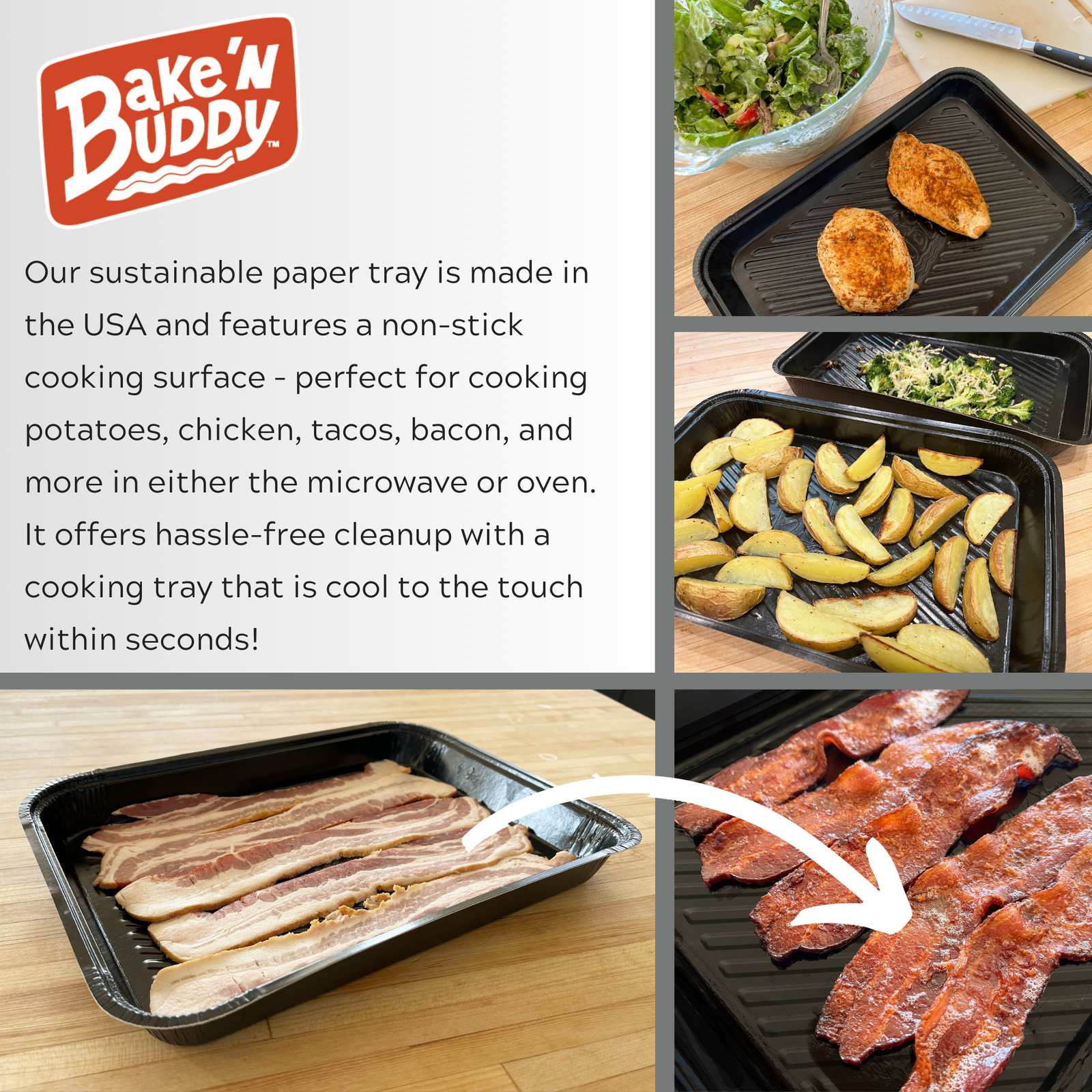 Finally - an environmentally-friendly cooking solution for some of your favorite foods! It's sustainable, mess-free, and cool to the touch in seconds - you can even eat off of it! Bake 'N Buddy™ is a disposable paper cooking tray that's your answer to cooking the messiest foods - even bacon.